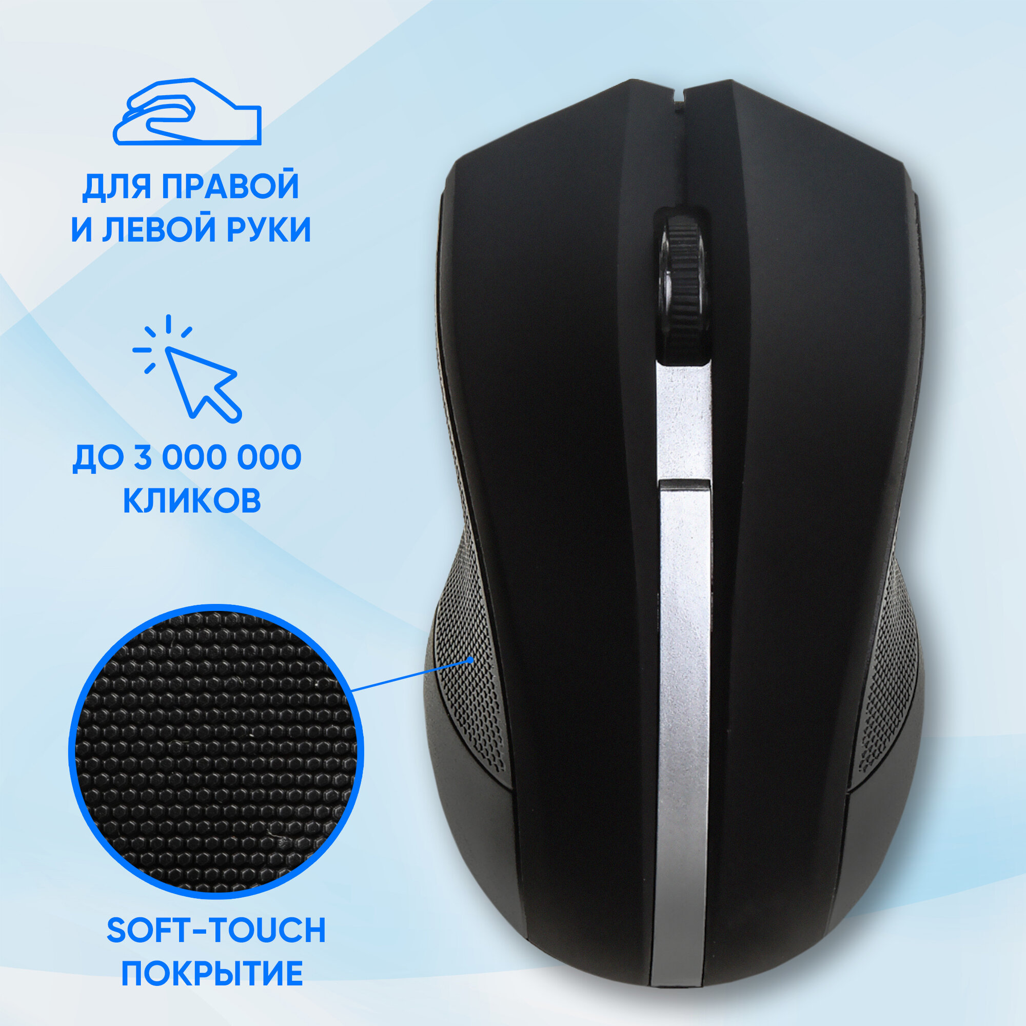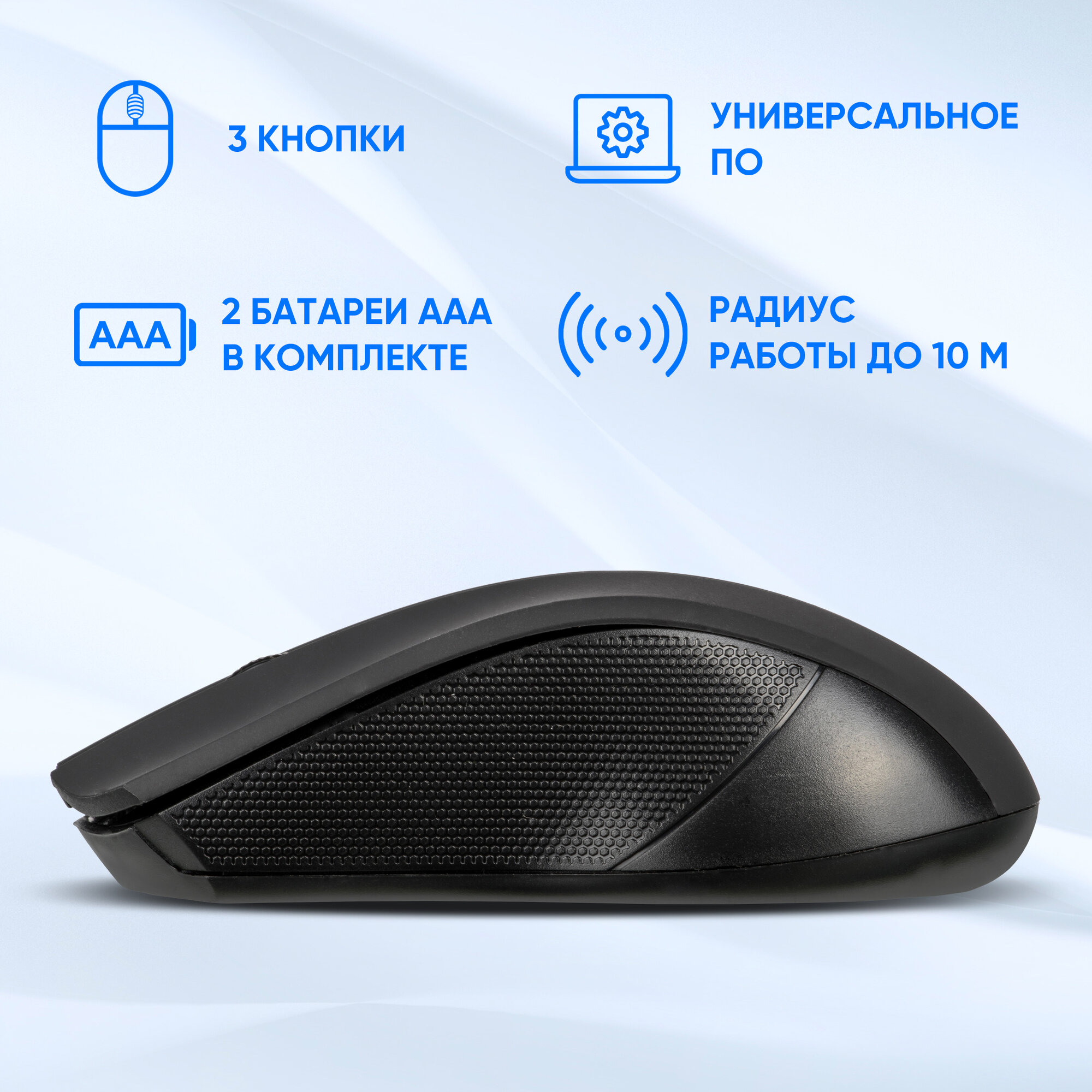 Удобная форма, четкая работа. Шершавые боковые поверхности, мышь достаточно уверенно лежит в руке. Батарейки в комплекте. |