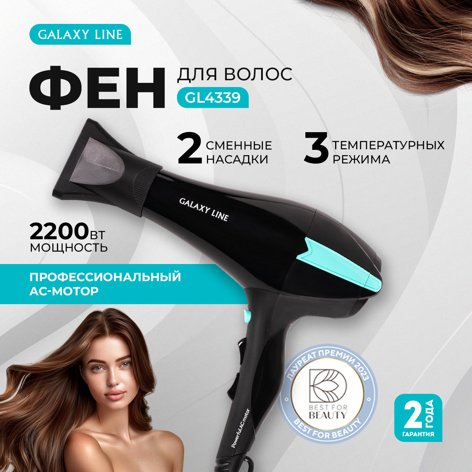ФЕН для волос 2200ВТ 2 скор 3 темп РЕЖ ХОЛ возд ПРОФ МОТ 2 НАС (ускорен;точеч СУШ ) GALAXY LINE