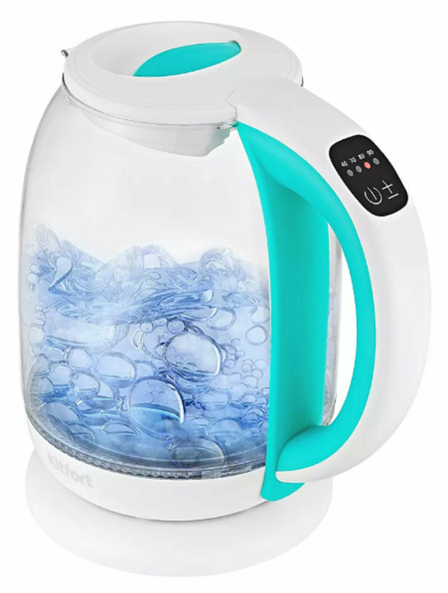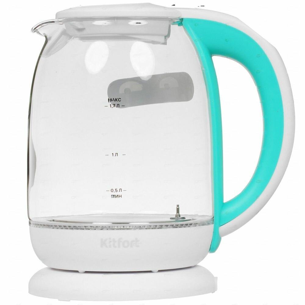 Чайник KITFORT КТ-6140-3, 1,7 л, 2200 Вт, закрытый нагревательный элемент, терморегулятор, стекло, белый/бирюзовый . Комплект - 1 шт.