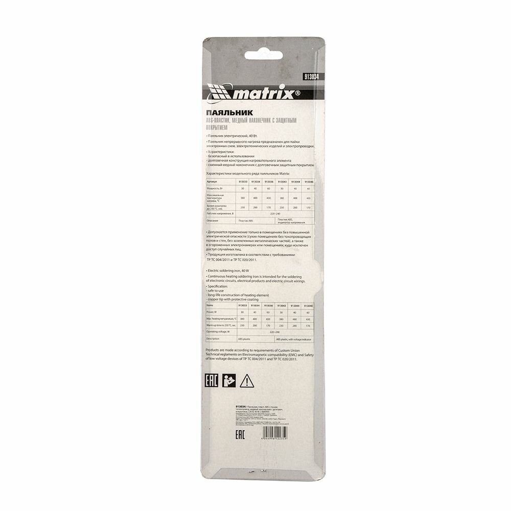 MATRIX Паяльник, пластик ABS с пониженной теплопроводностью, медный наконечник с долговечным покрытием, 220 В, 40 W Matrix, ( 913034 )