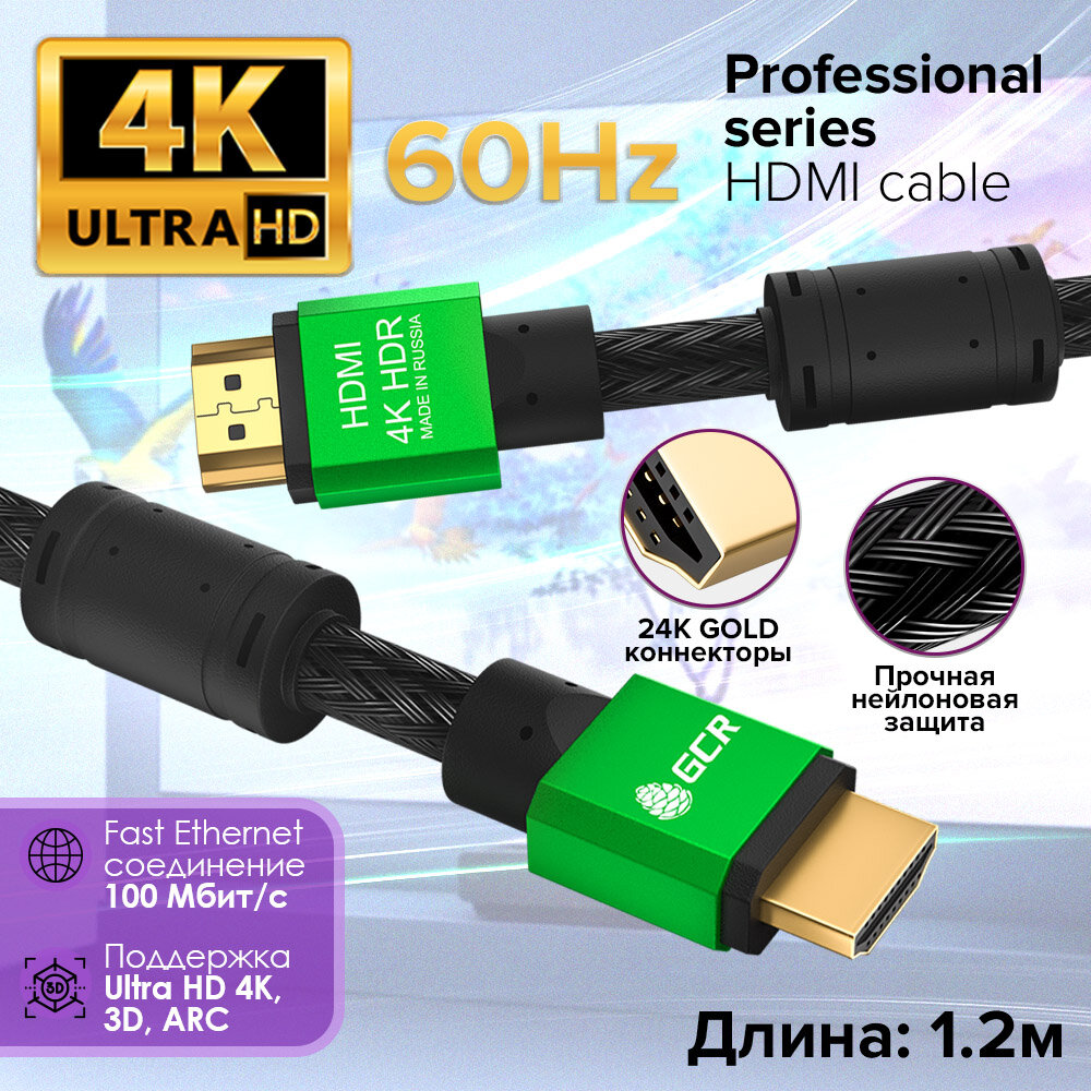 Купить HDMI провод 1.2м GCR Ultra HD 4K 3D 18 Гбит/с частично нейлон черно-зеленый 24K GOLD с ферритовыми кольцами