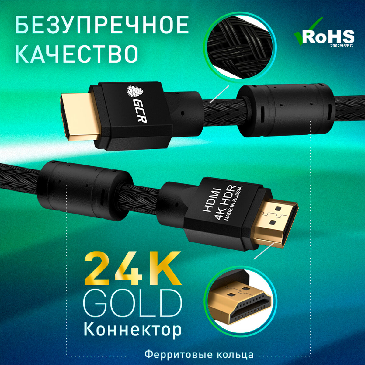 HDMI кабель 7.5м GCR Ultra HD 4K 3D 18 Гбит/с частично нейлон черный с ферритовыми кольцами 24K GOLD
