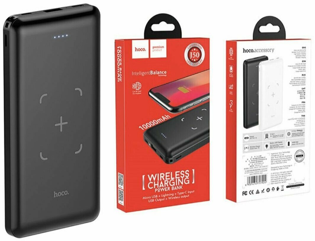 Универсальный Доп. Аккумулятор 10000mAh, J50, HOCO, c беспроводной зарядкой черный