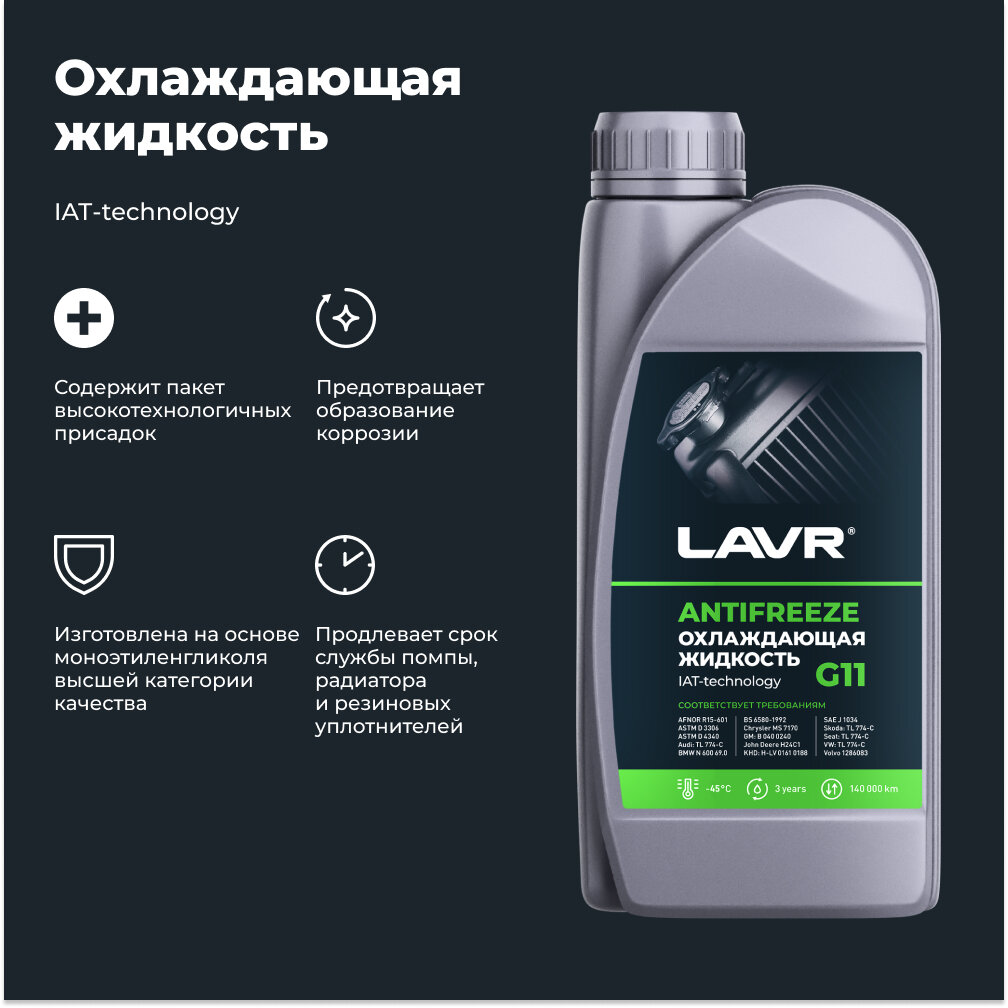 Ниже Вы можете прочитать отзывы на LAVR LN1705 Охлаждающая жидкость Antifreeze G11 (-40 -45°С) 1 КГ, ознакомится с подробными характеристиками, посмотреть интересные обзоры и фотографии на LAVR LN1705 Охлаждающая жидкость Antifreeze G11 (-40 -45°С) 1 КГ.