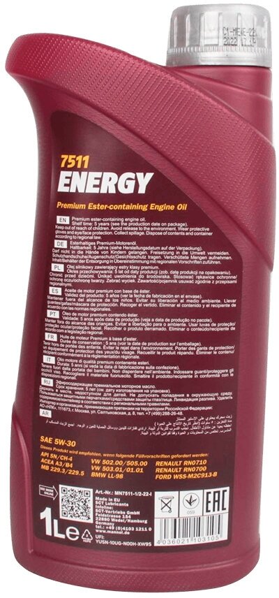 Масло Mannol Energy 5W30 синт. 7511 (1 л) API SN, ACEA A3/B4, FORD WSS-M2C913-B; VW 502.00/505.00; MB 229.3