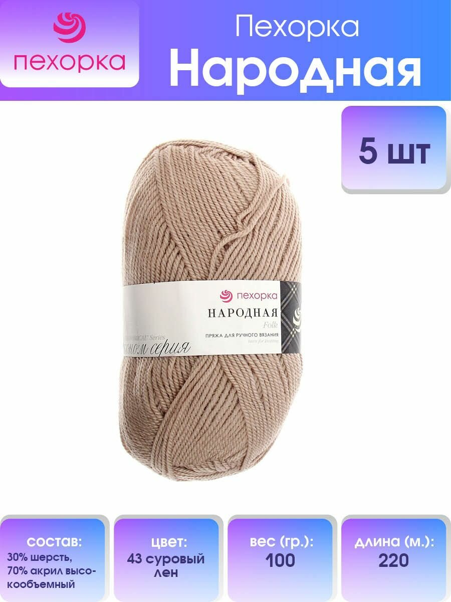 Пряжа Пехорский текстиль "Народная", 30% шерсть, 70% акрил, 220+-13 м, №043, цвет Суровый лен, 5 шт по 100 г