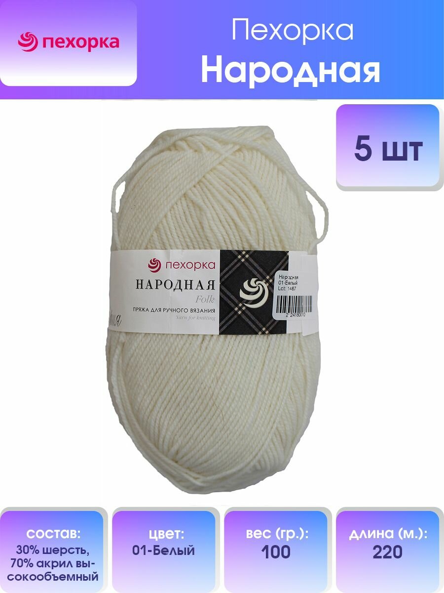 Пряжа для вязания Пехорка 'Народная', 100г, 220м (30% шерсть, 70% акрил высокообъемный) (01 белый), 5 мотков