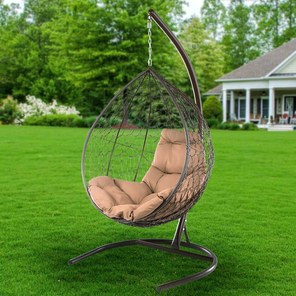 Подвесное кресло из ротанга "Капля" коричневое с бежевой подушкой M-Group