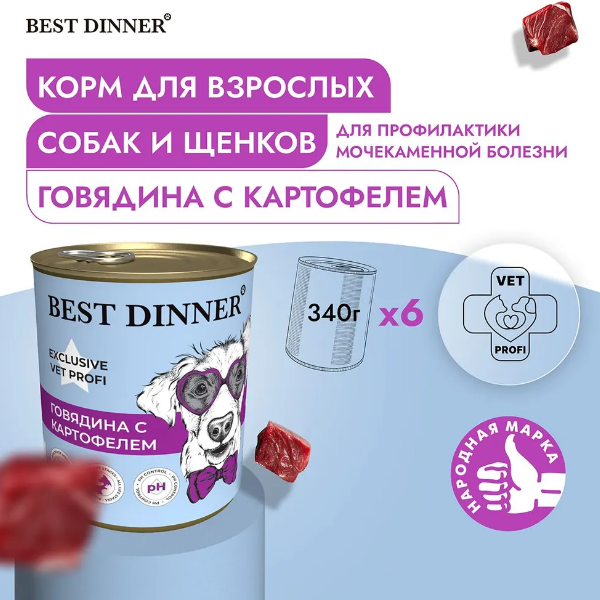 Влажный консервированный корм для собак Best Dinner Бест Диннер Urinary "Говядина с картофелем" Exclusive VET PROFI-340 гп. По 6 шт.
