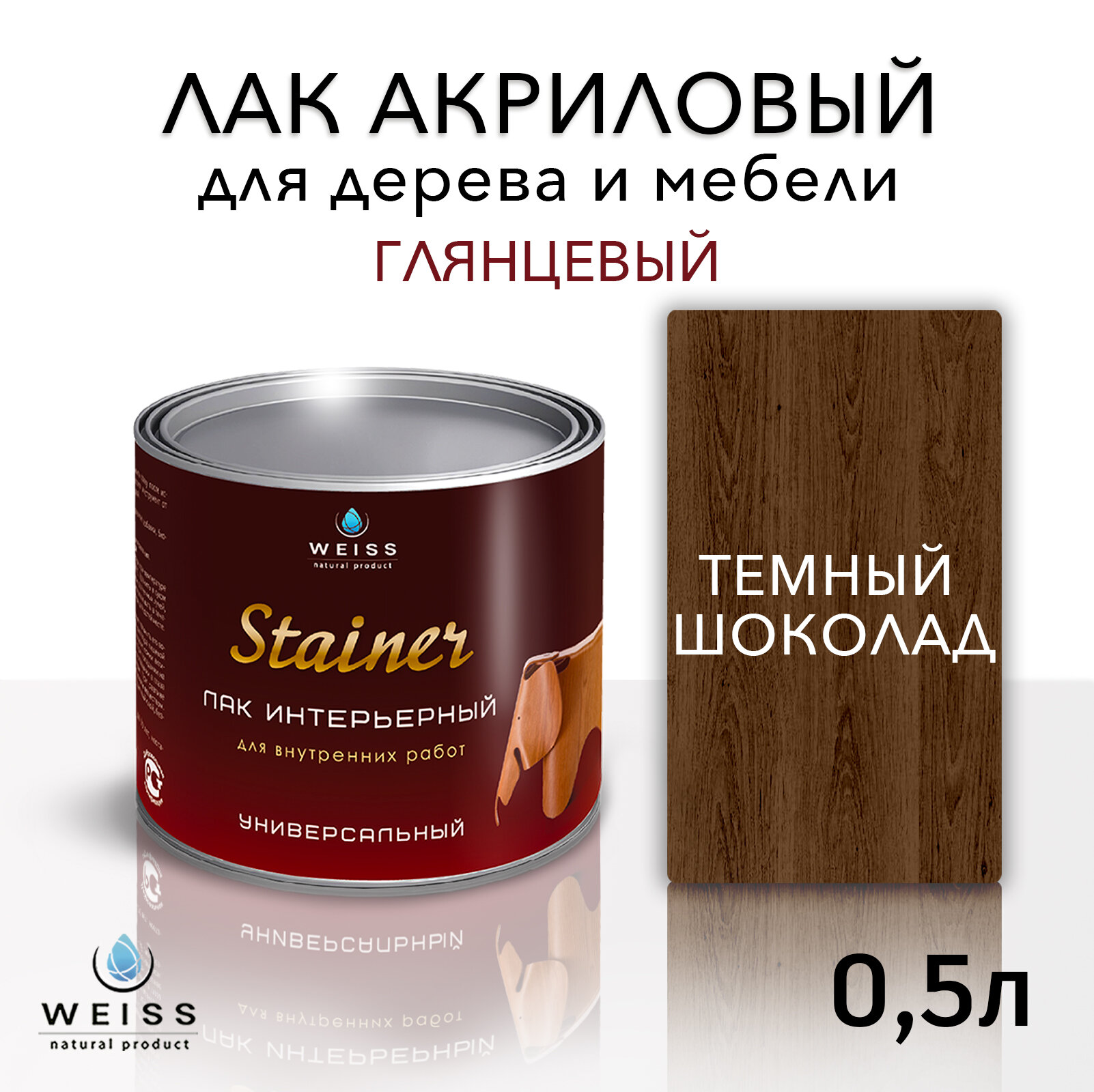 Лак для дерева акриловый венге, глянцевый, Weiss natural product, без запаха, самовыравнивающийся, 0.5л