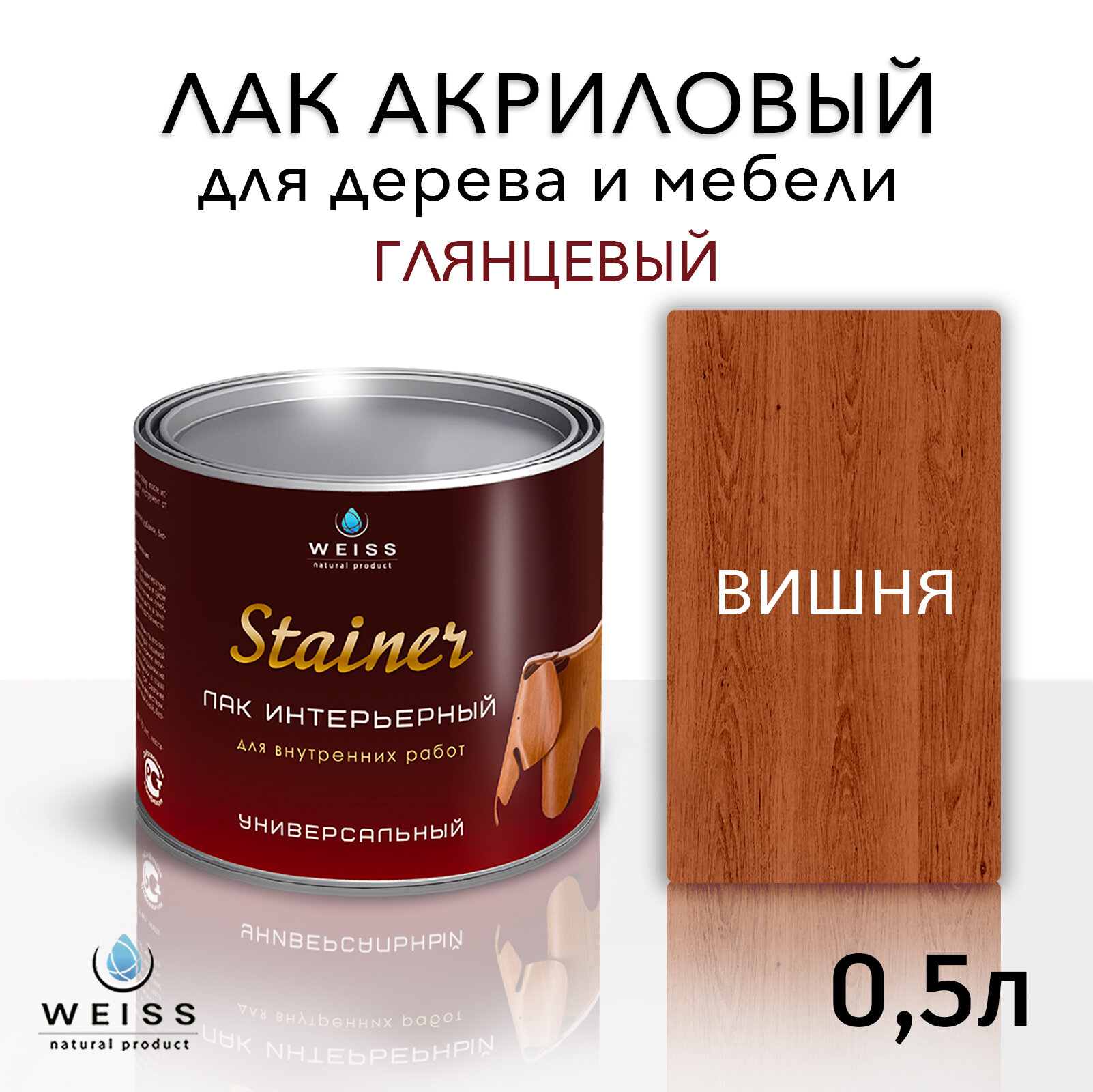 Лак для дерева акриловый вишня, глянцевый, Weiss natural product, без запаха, самовыравнивающийся, 0.5л