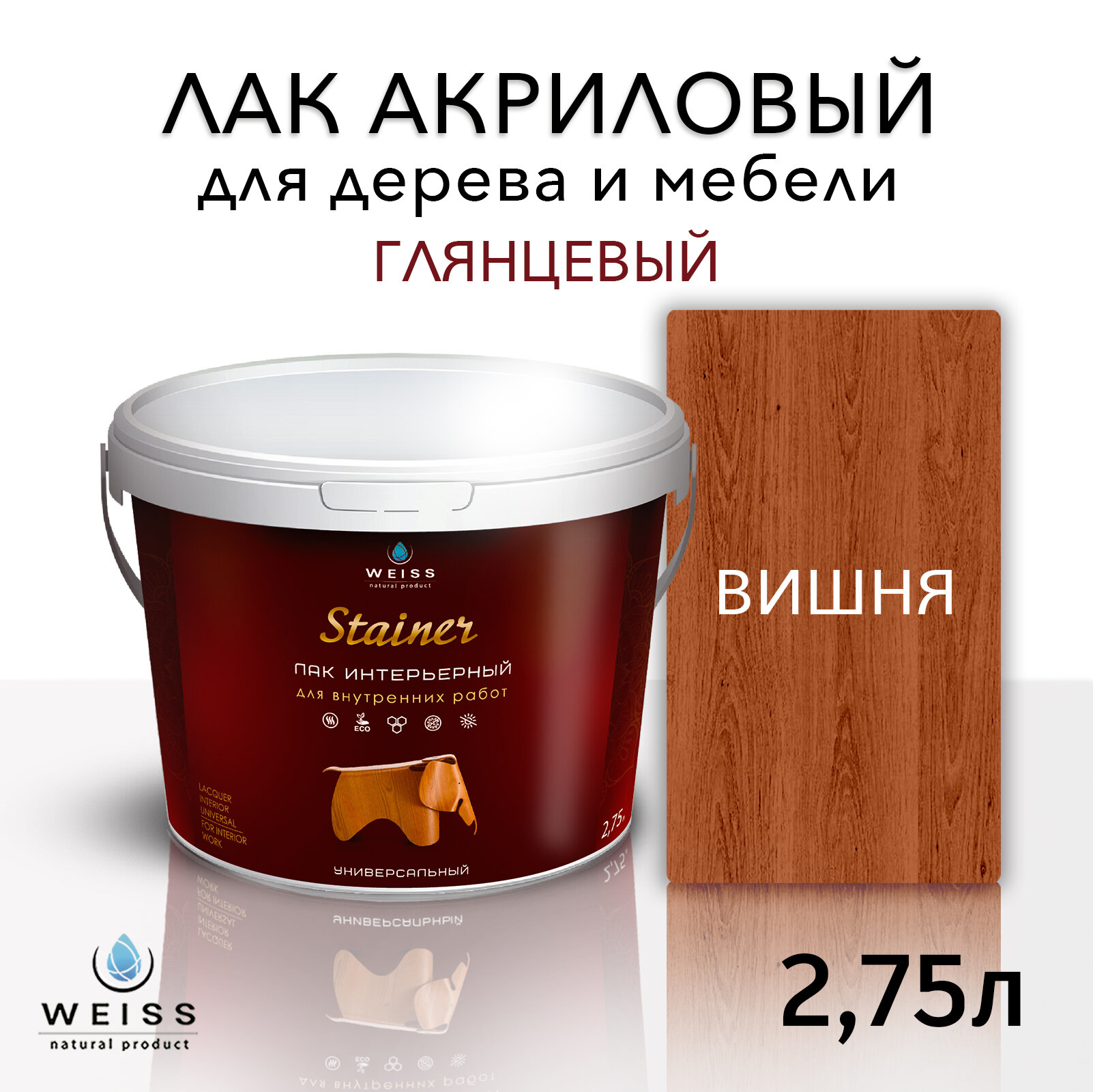 Лак для дерева акриловый вишня, глянцевый, Weiss natural product, без запаха, самовыравнивающийся, 2.75л