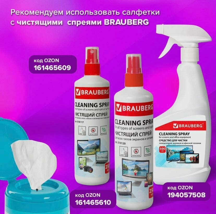 Салфетки чистящие д/экранов всех типов BRAUBERG, 13x17 см, 100 шт в тубе, пл, влажн, антиб