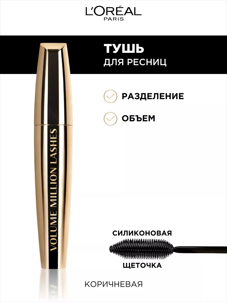 L'OREAL Тушь для ресниц Volume Million Lashes Gold для объема и разделения, 10,7 мл, Коричневая
