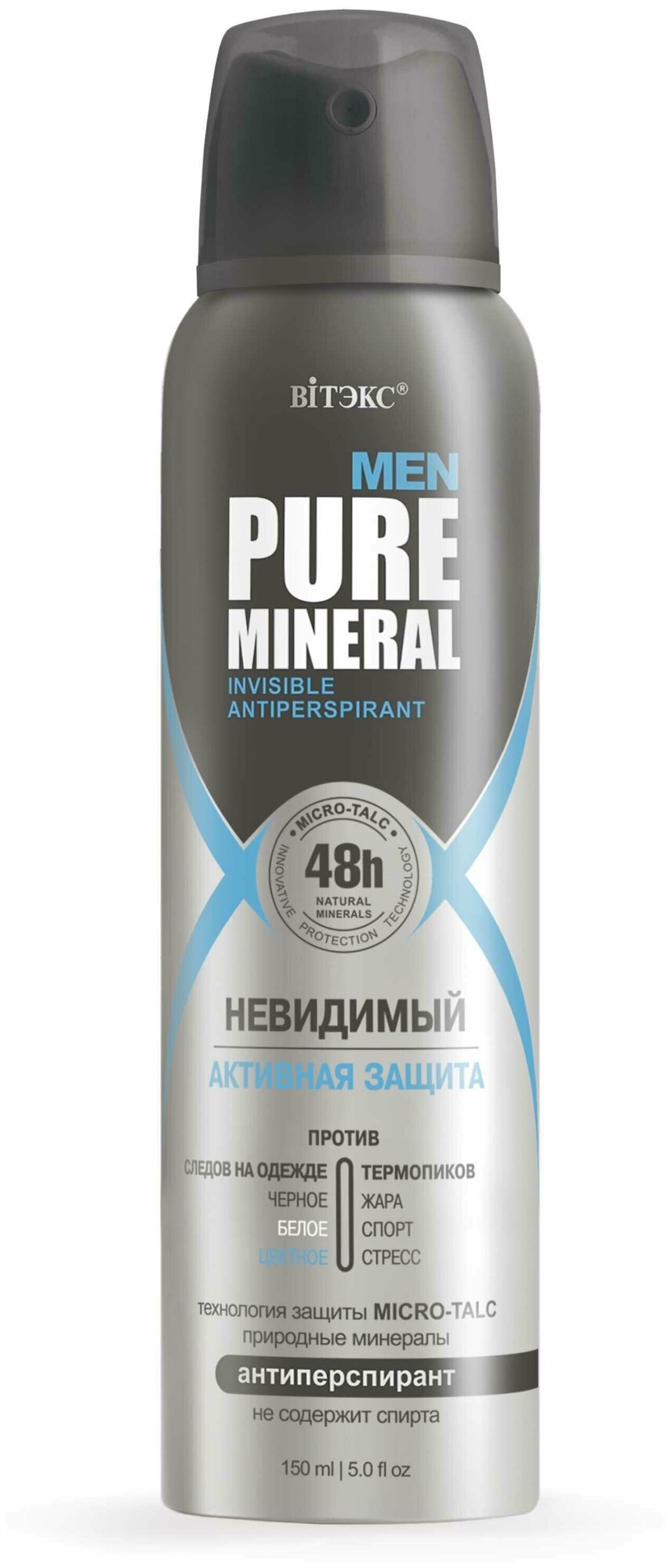 Антиперспирант невидимый, "Активная защита", 150 мл, аэрозольный баллон, pure Mineral MEN, Витэкс, 4810153032560