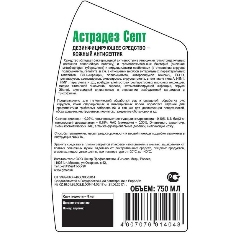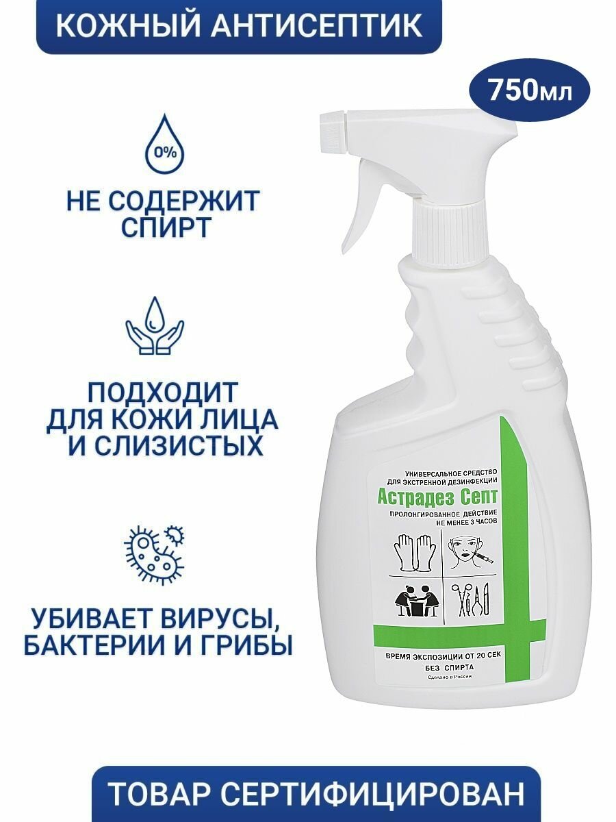 Антисептик кожный дезинфицирующий бесспиртовой с распылителем 750 мл астрадез-септ, готовый раствор
