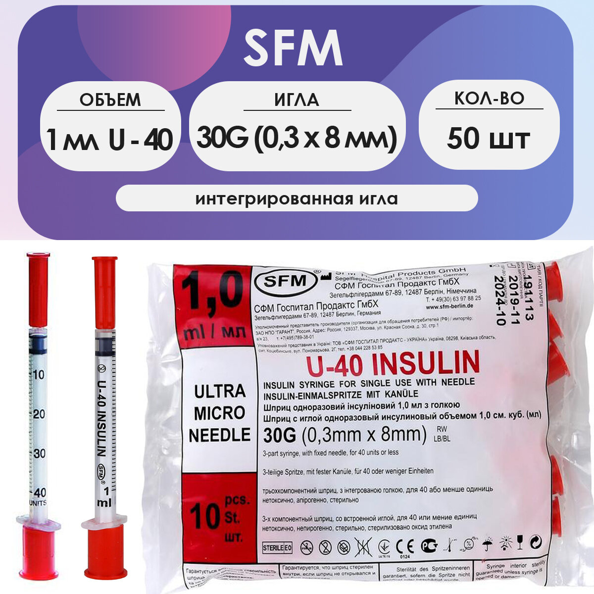 Шприц SFM инсулиновый (3-х комп.) 1 мл U40 интегрированная игла 30G (0,3 х 8 мм) - 50 шт комплект