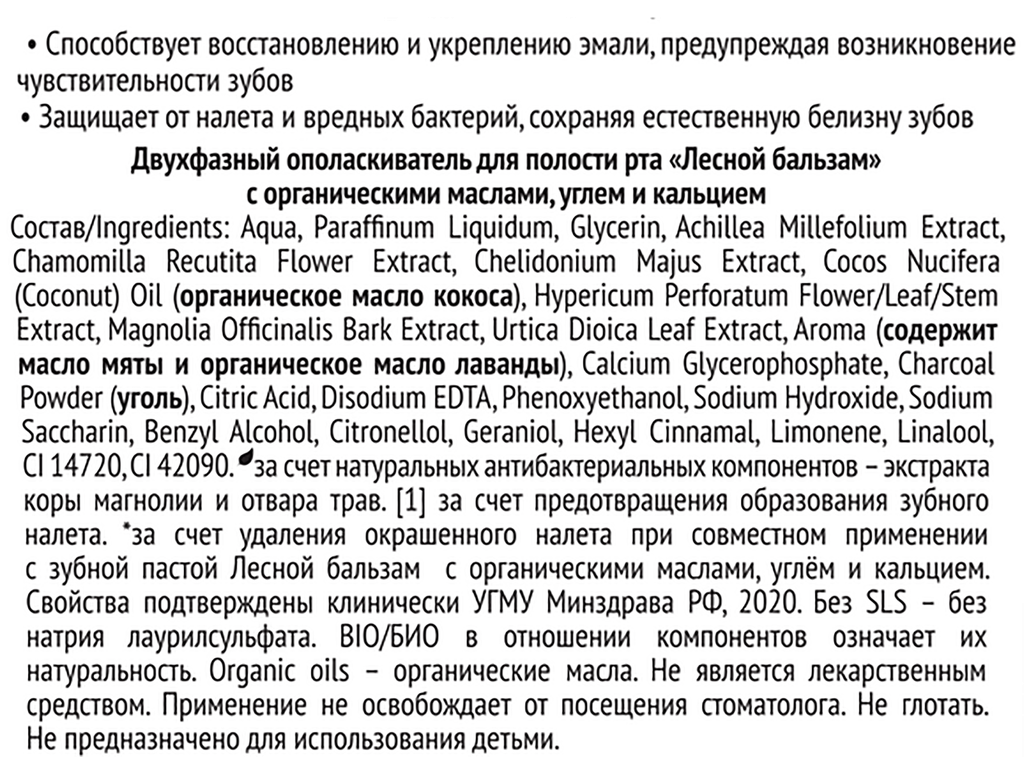 Лесной Бальзам ополаскиватель двухфазный для полости рта с органическими маслами углём и кальцием 250мл