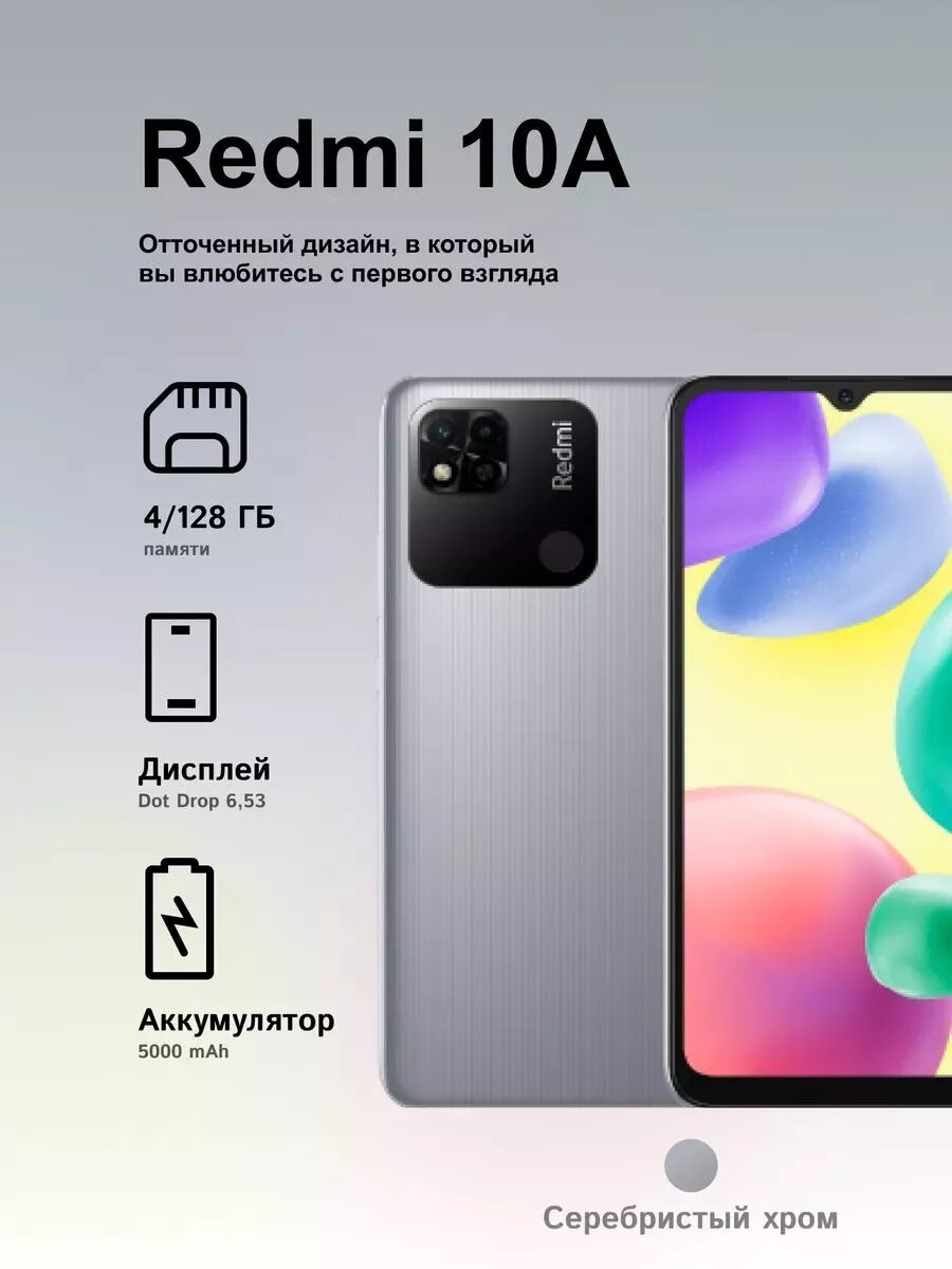 Смартфон Xiaomi Redmi 10A 4/128 ГБ CN, 2 nano SIM, серебристый хром