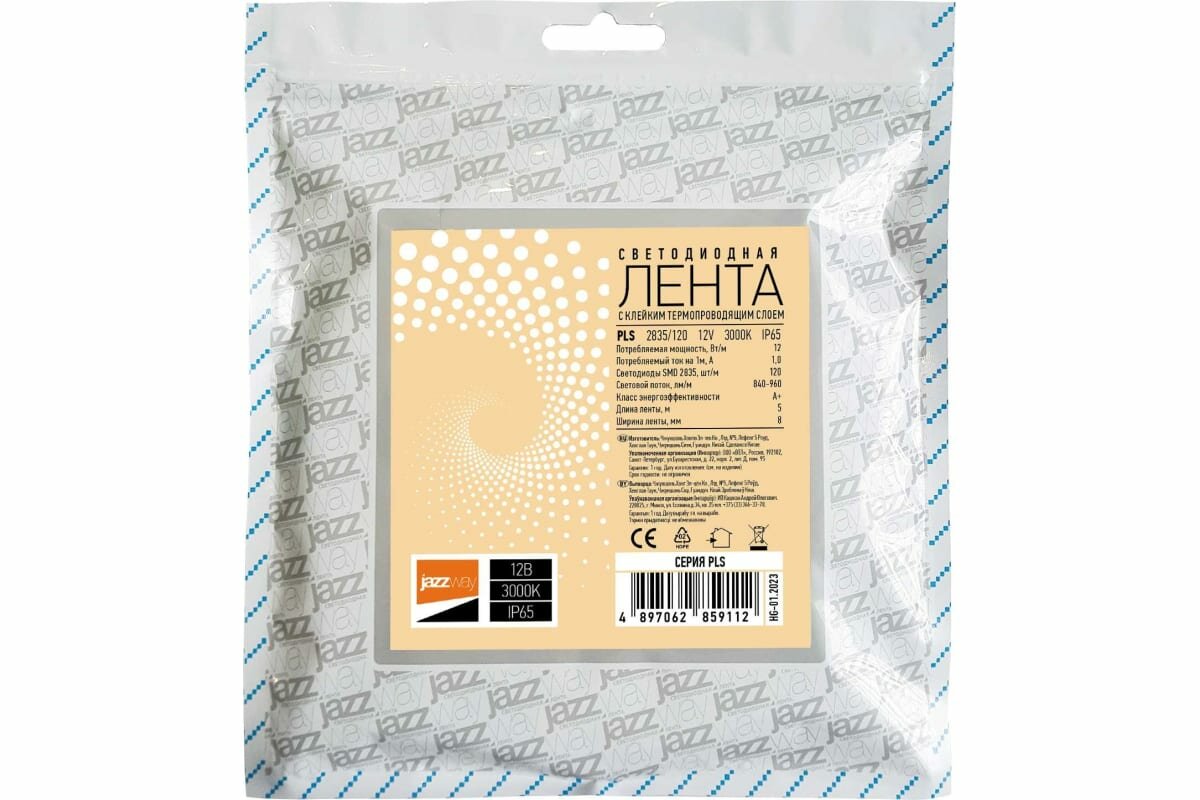 Лента светодиодная PLS 2835/120-12V-W 12Вт/м IP65 бел. свет (уп.5м) JazzWay JAZZ WAY 2859099 (1 упак)
