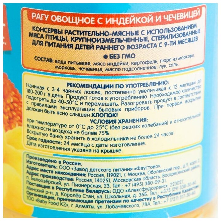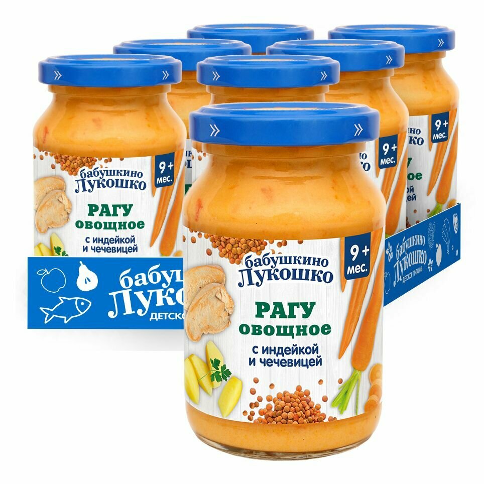 Пюре Бабушкино Лукошко Рагу овощное с индейкой и чечевицей, с 9 месяцев, 190 г, 6 шт.