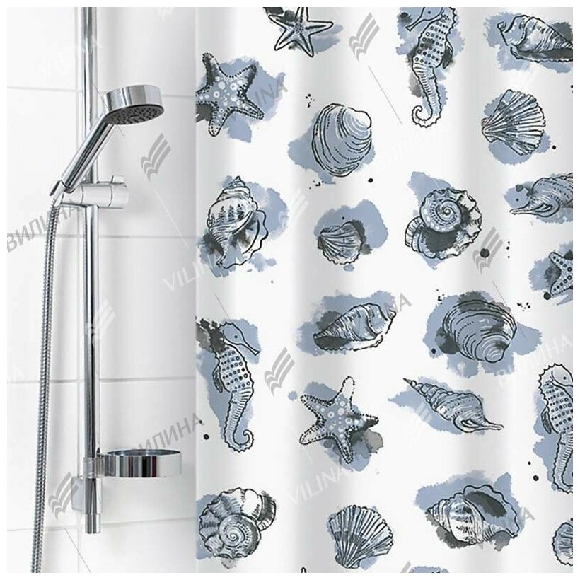 Штора для ванной комнаты VILINA водонепроницаемая с рисунком занавес с кольцами 180х180 см Ракушки белая