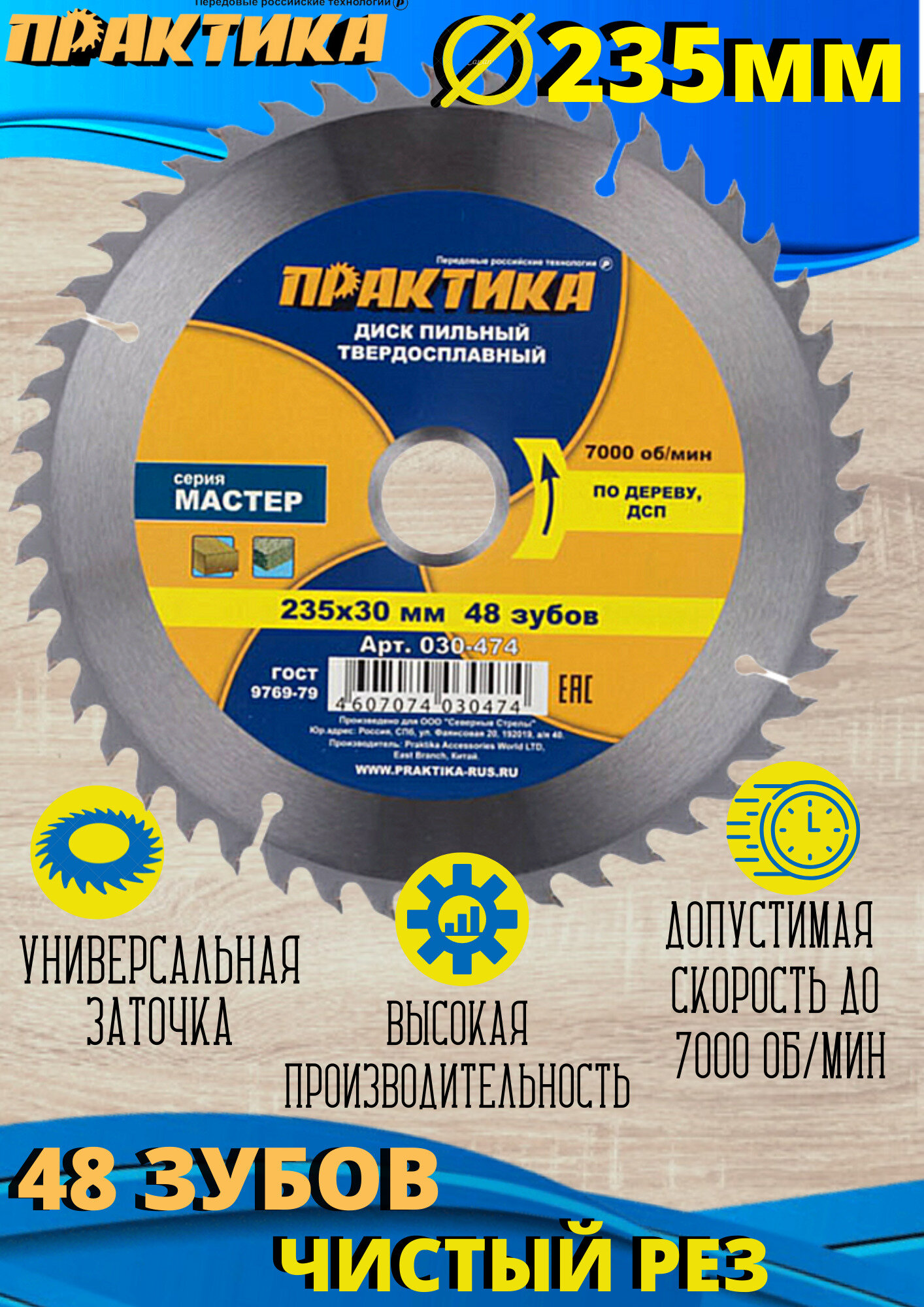 Диск пильный 235*30 мм 48 зубьев по дереву, ДСП "Практика"