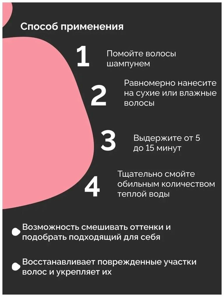 | Плюсы: | Пигмент яркий! Держится долго от 2 недель до месяца, в зависимости от того как часто и чем моете волосы. Запах приятный. |