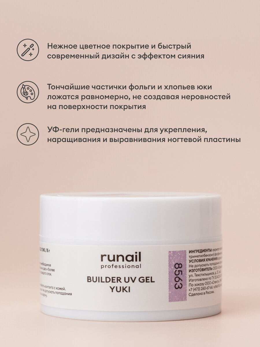RuNail, BUILDER UV GEL YUKI - моделирующий УФ-гель с хлопьями Юки №8563, 15 гр
