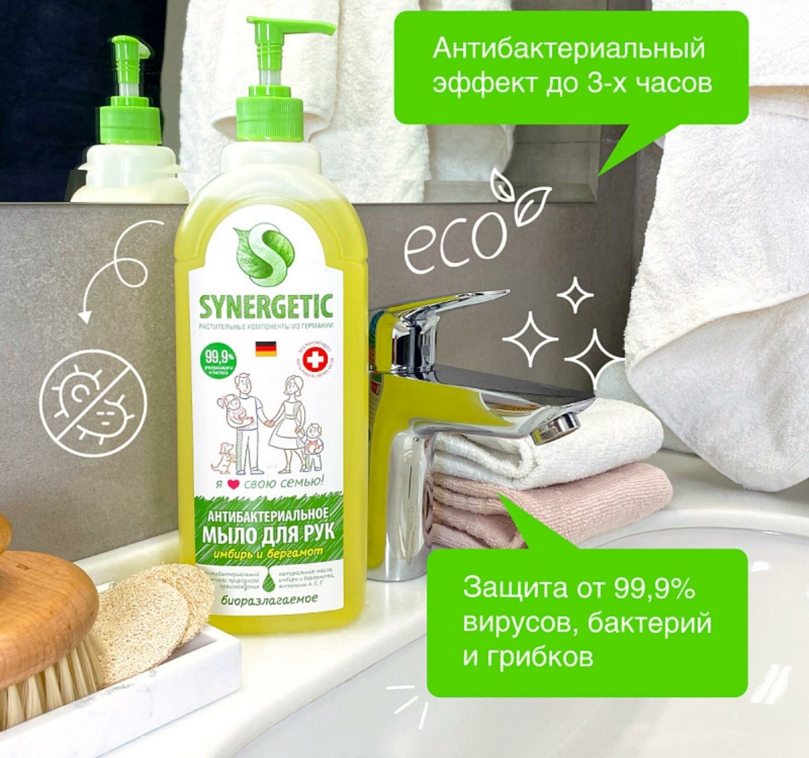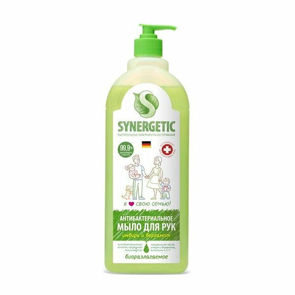 Мыло жидкое SYNERGETIC 500мл Имбирь/бергамот Антибактериальное дозатор