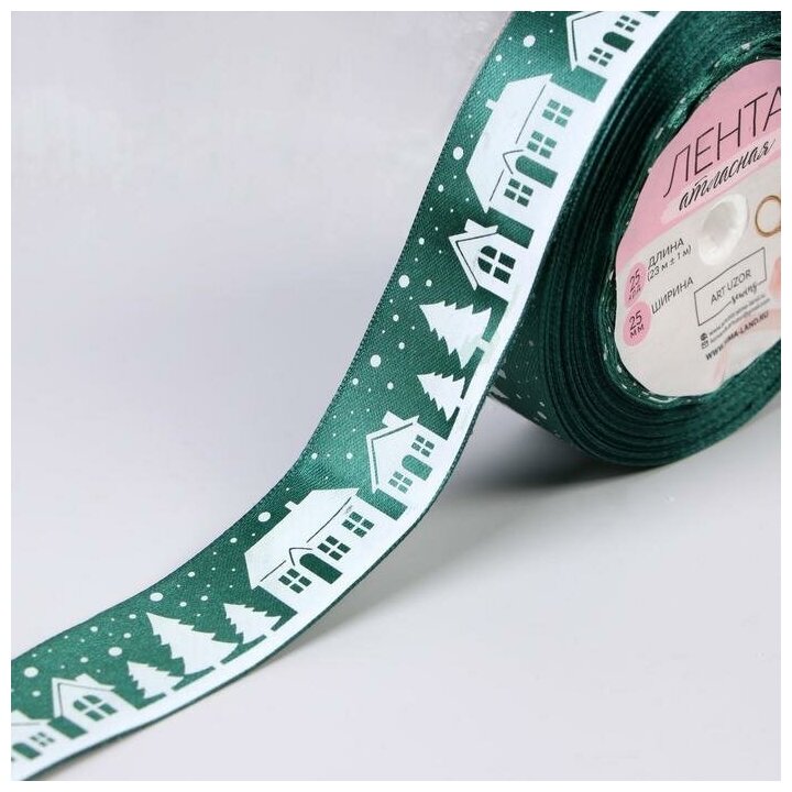 Лента атласная «Домики», 25 мм, 23 ± 1 м, цвет зелёный №56