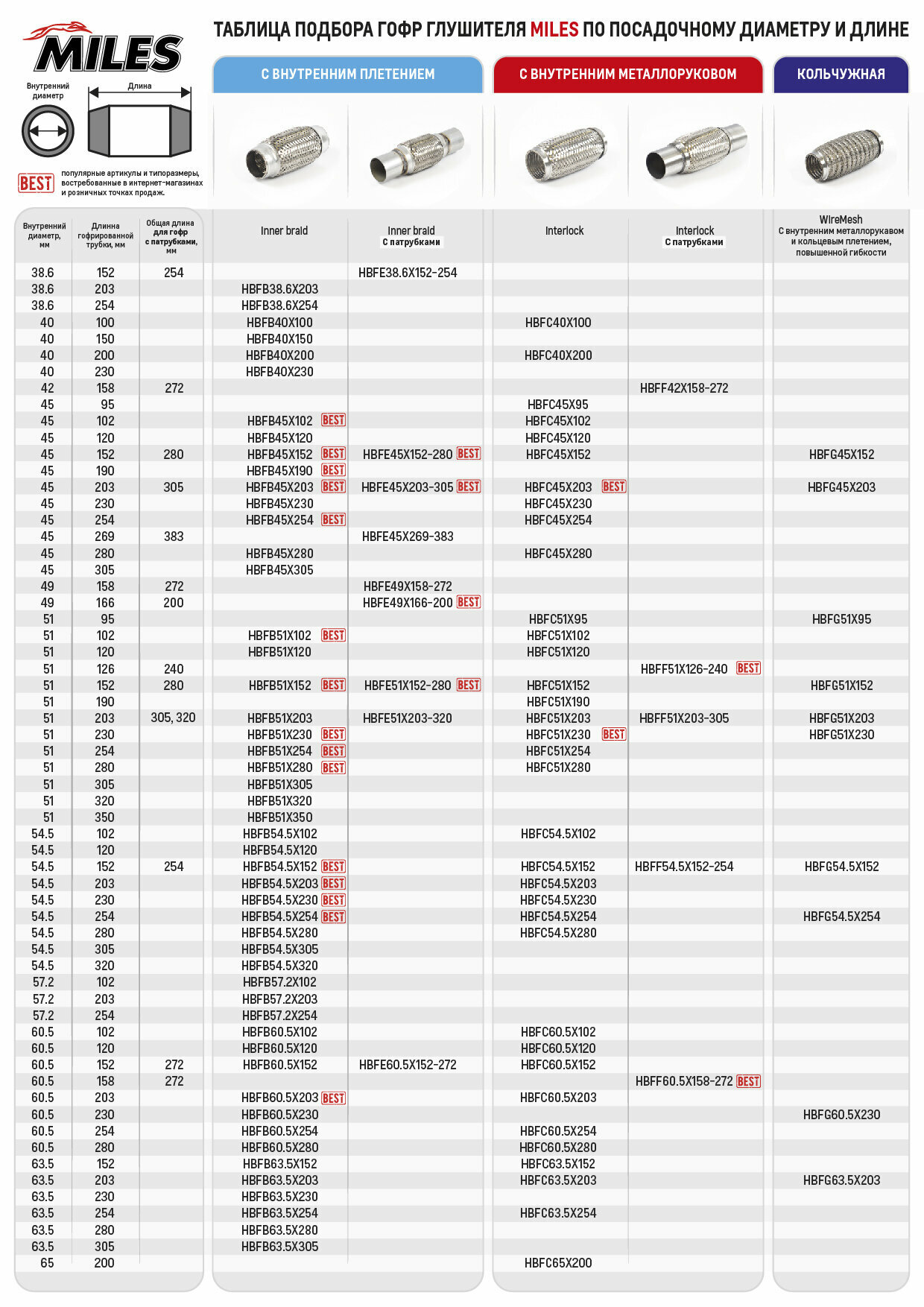 СохранитьMILES HBFE386X152254 Гофра глушителя 38,6 x 152-254 Miles внутреннее плетение с патрубками интересное: