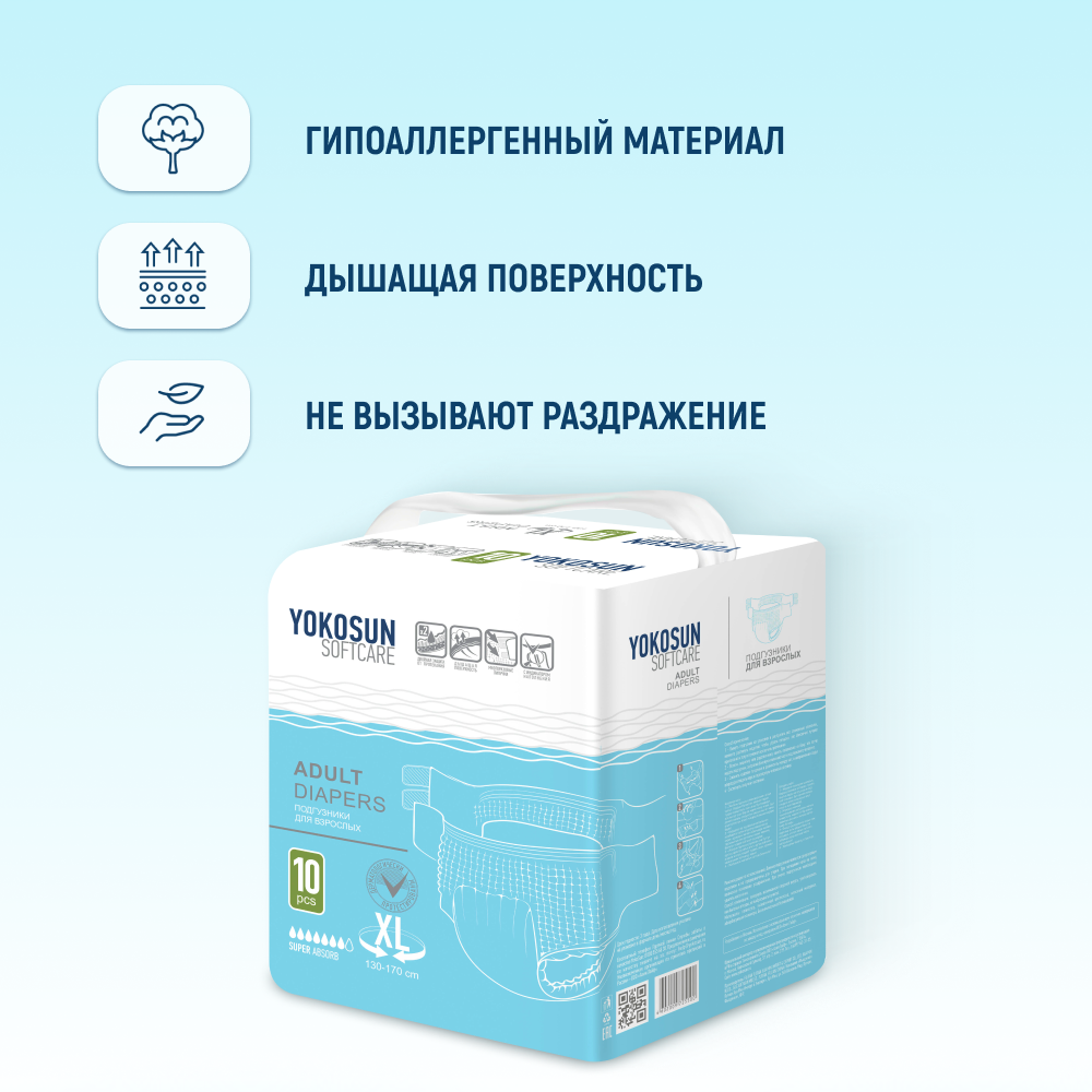 Подгузники для взрослых YokoSun Softcare на липучках, размер XL, 10 шт.