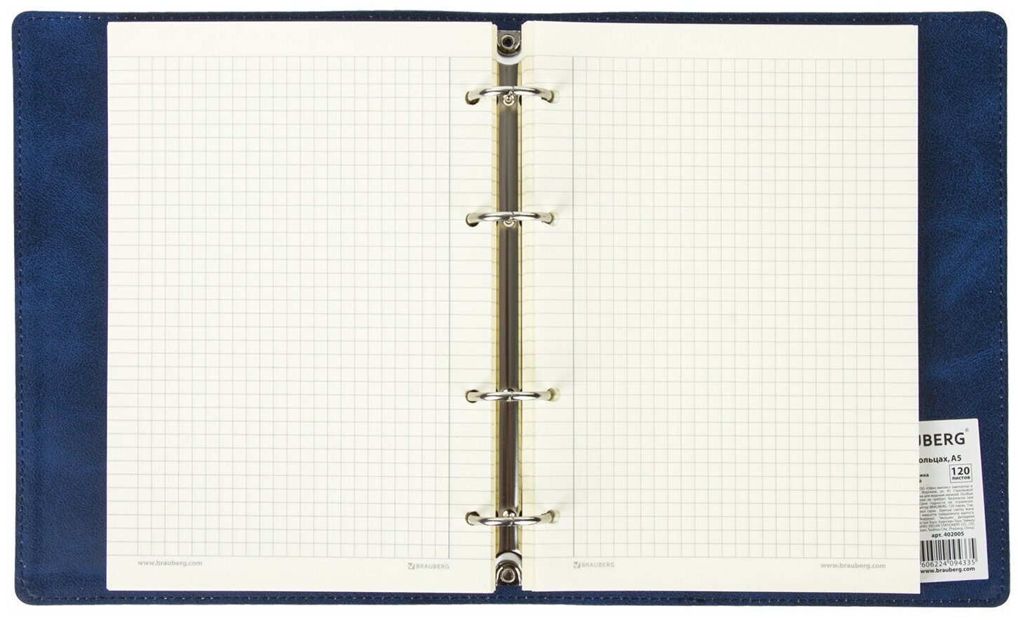 Тетрадь на кольцах со сменным блоком для учебы А5 (180х220 мм), 120 л., под гладкую кожу, вырубка под кольца, кремовый блок, Brauberg Main, клетка, синяя, 402005