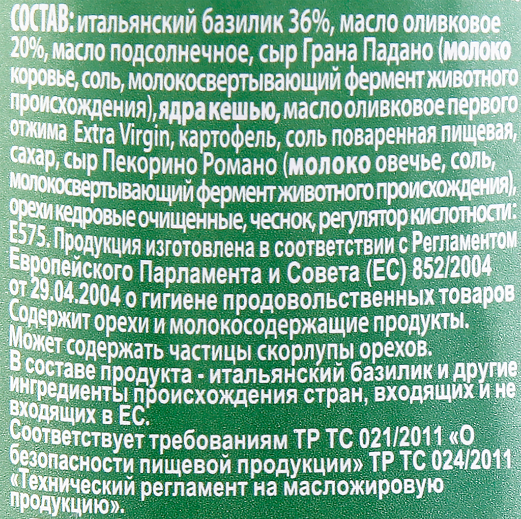 | Состав | итальянский базилик 36%, оливковое масло 20%, подсолнечное масло, сыр Грано Падано, ядра кешью, оливковое масло первого отжима, картофель, соль поваренная пищевая, сахар, сыр Пекорино Романо, орехи кедровые очищенные, чеснок, регулятор кислотности: Е575 |