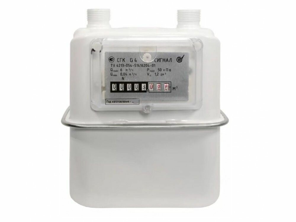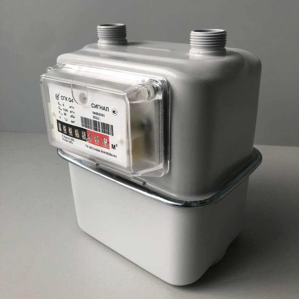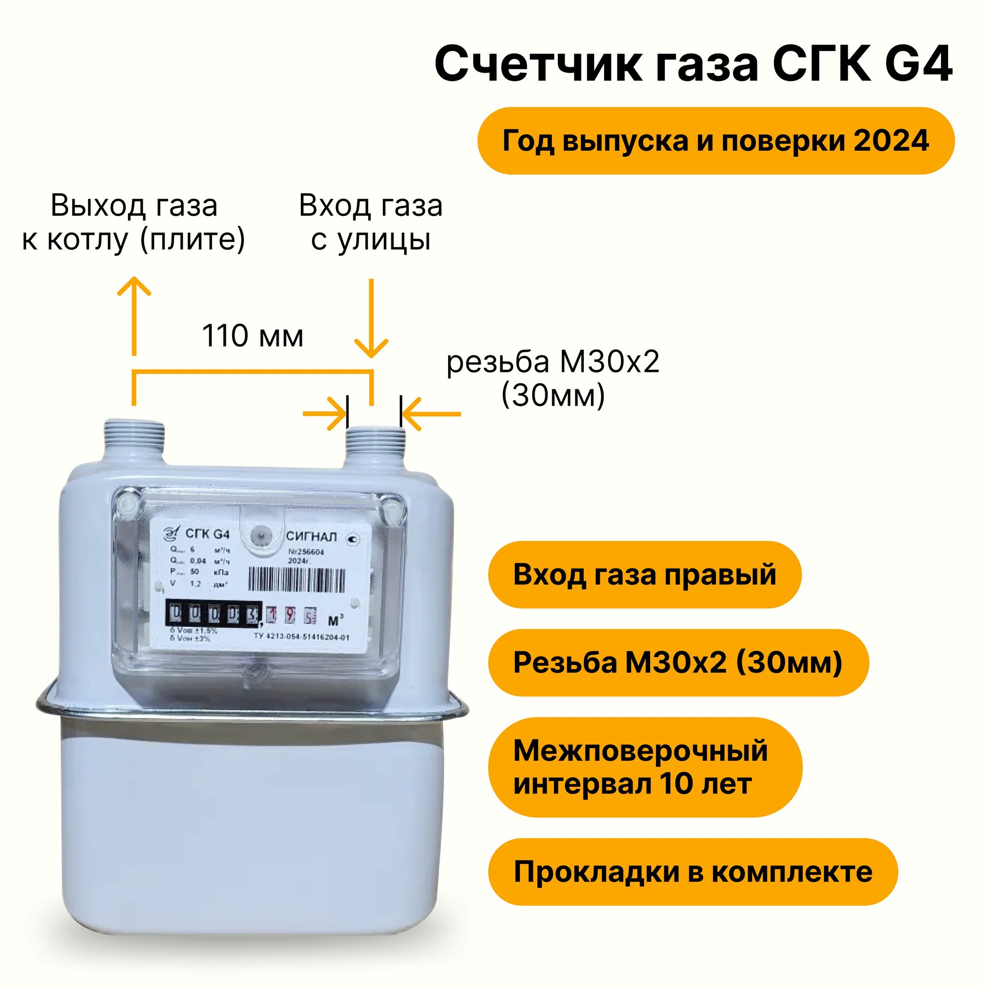 Счетчик газа бытовой Сигнал СГК G-4 (вход газа cправа-налево, резьба М30х2) 2023 года выпуска, + комплект прокладок
