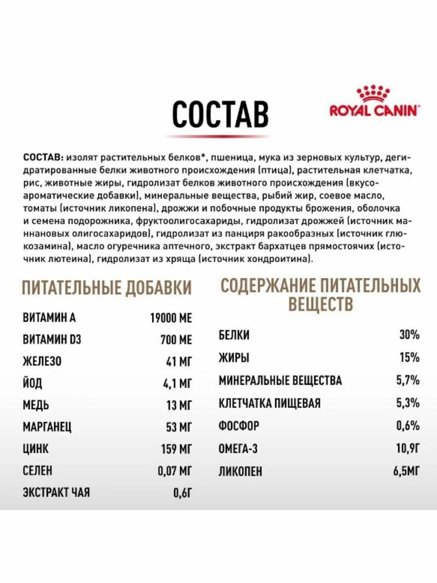 | Состав | дегидратированные белки животного происхождения (птица), изолят растительных белков, пшеница, мука из зерновых культур, растительная клетчатка, животные жиры, гидролизат белков животного происхождения (вкусоароматические добавки), рис, минеральные вещества, рыбий жир, дрожжи и побочные продукты брожения, соевое масло, фруктоолигосахариды, хлорид аммония |