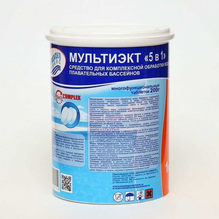 Маркопул Кемиклс, мультиэкт "5 в 1", 1кг банка, таблетки 200г, комплексное средство для обеззараживания и очистки воды, уп.12