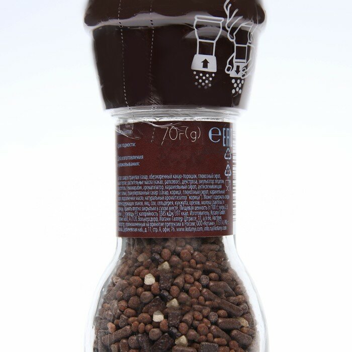 | Состав | сахарная посыпка (сахар, обезжиренный какао-порошок, крахмальная патока, какао-масса, растительное масло (кокосовое, рапсовое), декстроза, эмульгатор: лецитин, загуститель: гуммиарабик, ароматизатор, карамельный сахарный сироп, антислеживатель: тальк, сахар, корица |