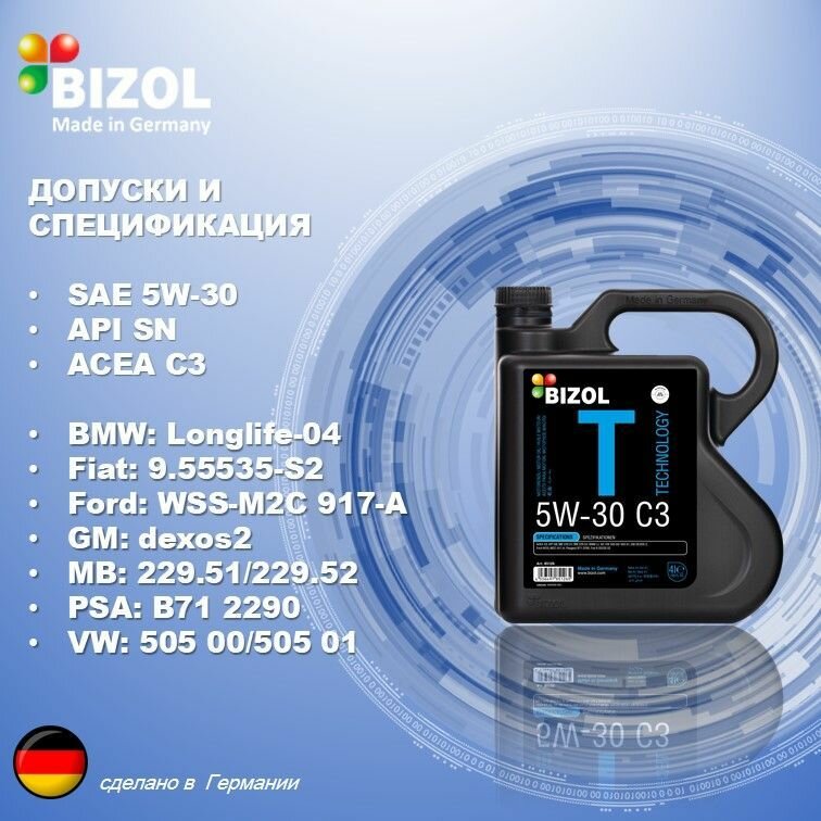 Масло моторное 5w30 bizol 4л нс-синтетика technology c3 api sn gm dexos 2/ford, bizol, 85126