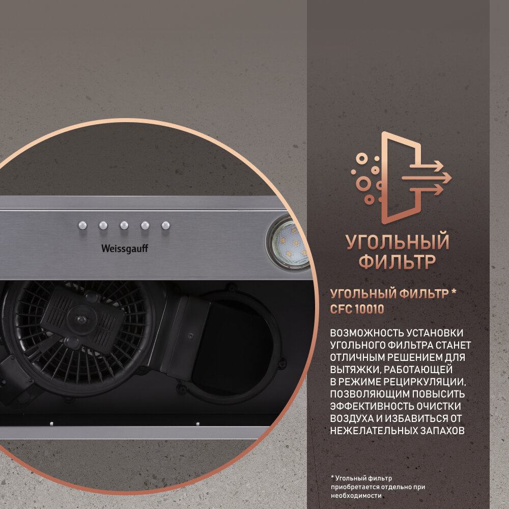 СохранитьКухонная встраиваемая вытяжка Weissgauff Alpha 50 PB IX 3 года гарантии, Алюминиевый жировой фильтр, Низкий уровень шума интересное: