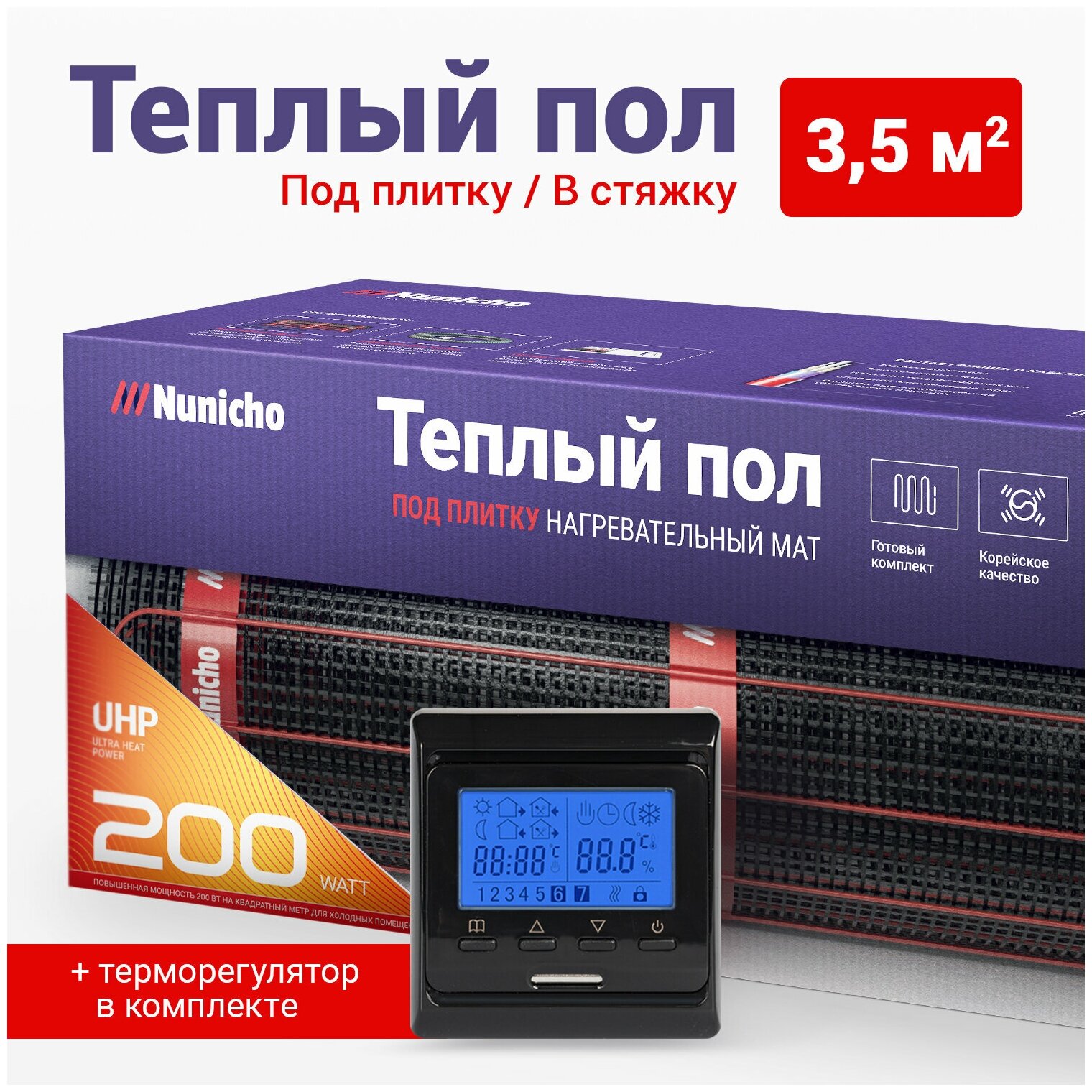 Теплый пол под плитку в стяжку NUNICHO 3,5 м2, 200 Вт/м2 с программируемым черным терморегулятором электрический нагревательный мат