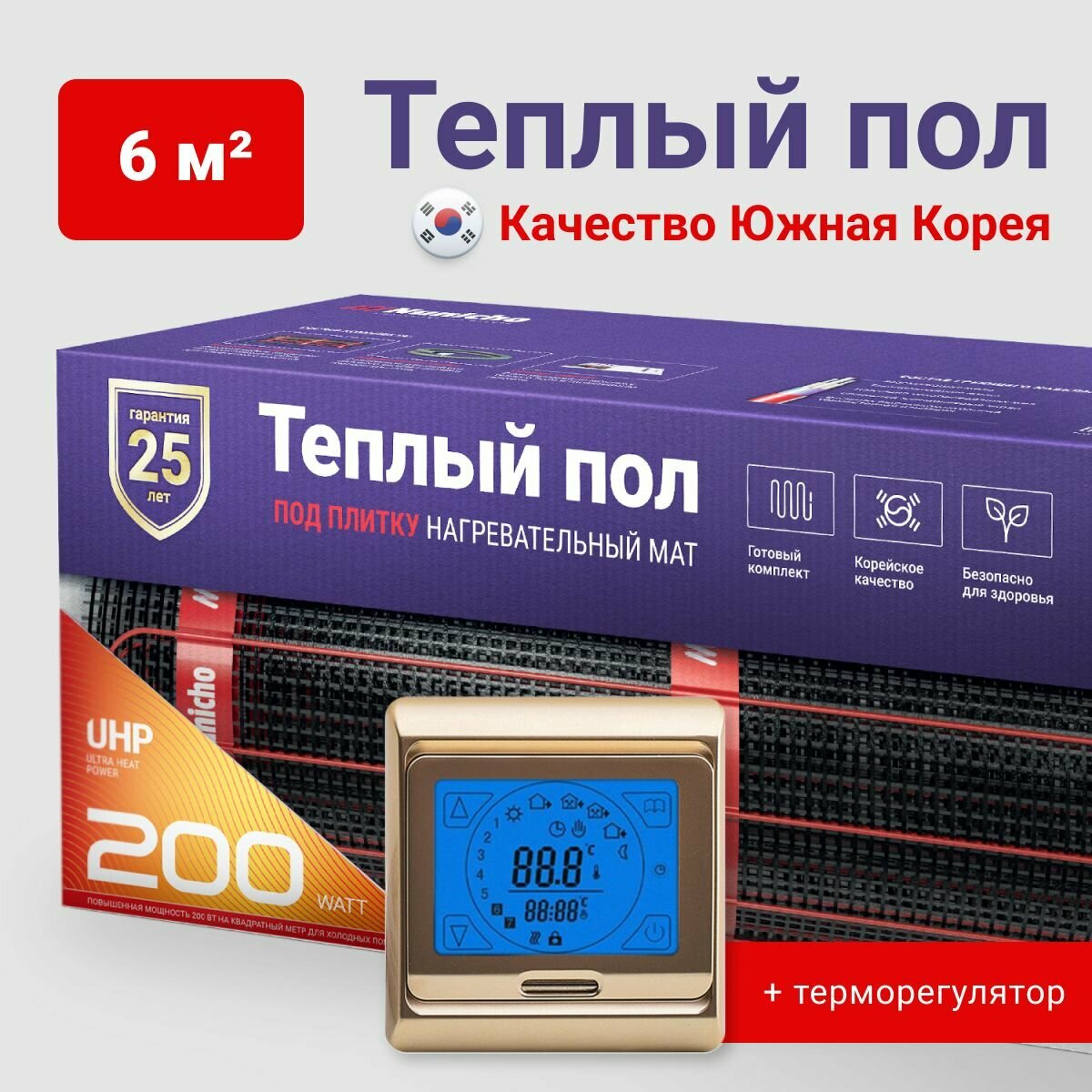Теплый пол электрический под плитку 6 м2 Nunicho 200 Вт/м2 с терморегулятором сенсорным золотистым, нагревательный мат пр-во Южная Корея