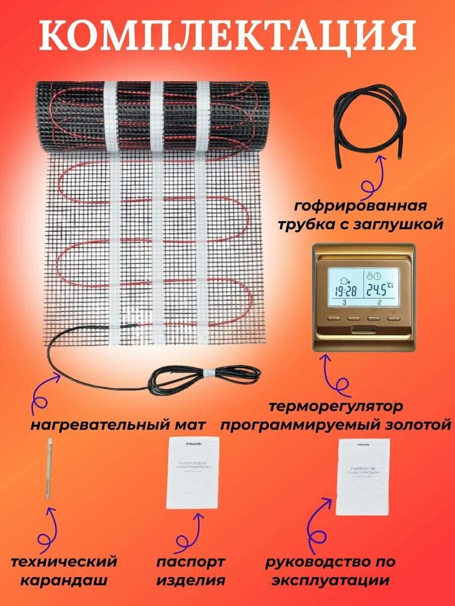 Теплый пол электрический под плитку 1 м2 Nunicho 200 Вт/м2 с терморегулятором программируемым золотистым, нагревательный мат