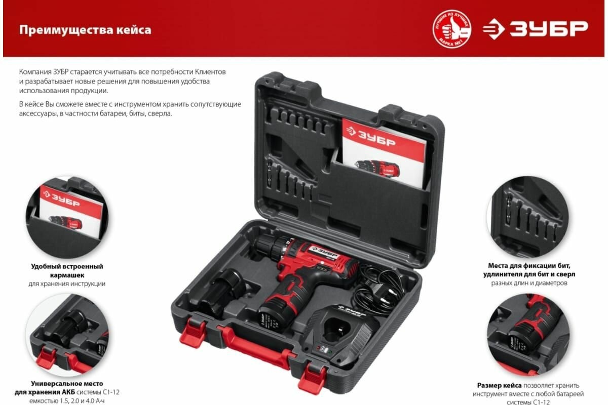 ABC Дрель-шуруповёрт Зубр ДШЛ-125-22, аккум. (Li-Ion 12В, 350/1300об./м., быстрозажимной) + кейс + доп.аккум