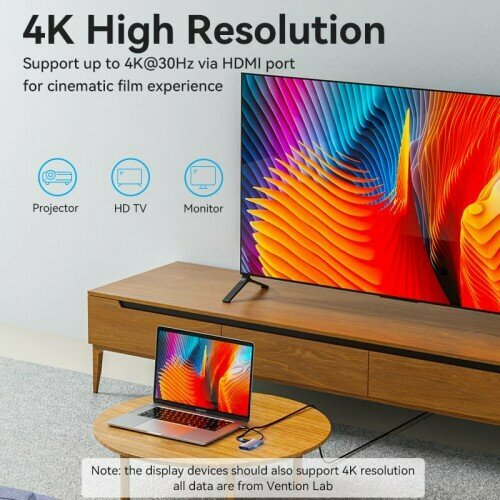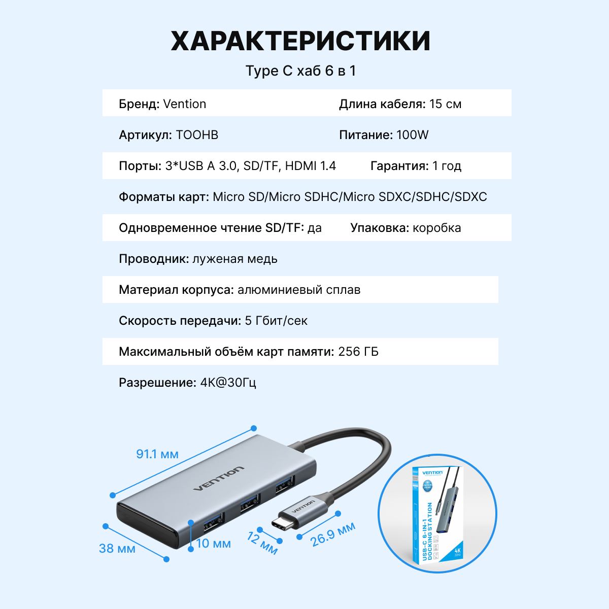 Vention Мультифункциональная док-станция 6 в 1, Type C/USB 3.0 + HDMI + SD + TF для ноутбука, телефона, шнур 15 см, арт. TOOHB