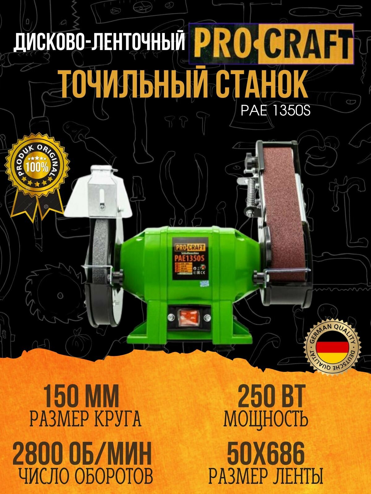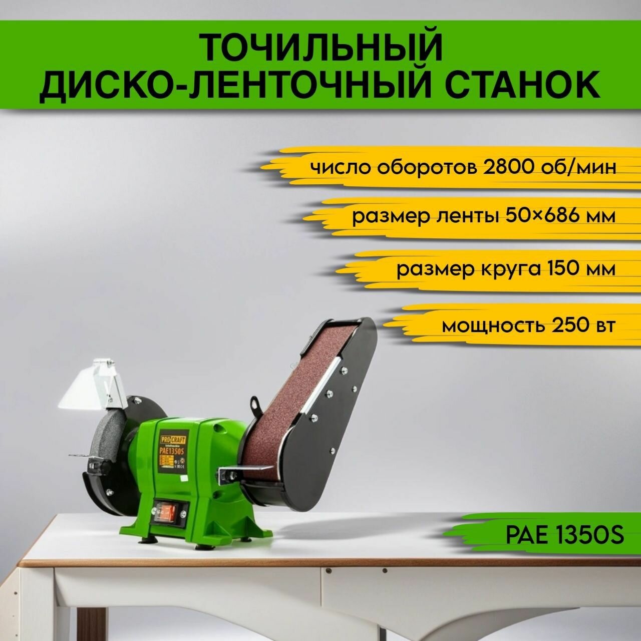 Точильный станок дисково-ленточный Procraft PAE-1350S, диск 150, ленты 50х686 мм, 250 Вт, 2800 об/мин