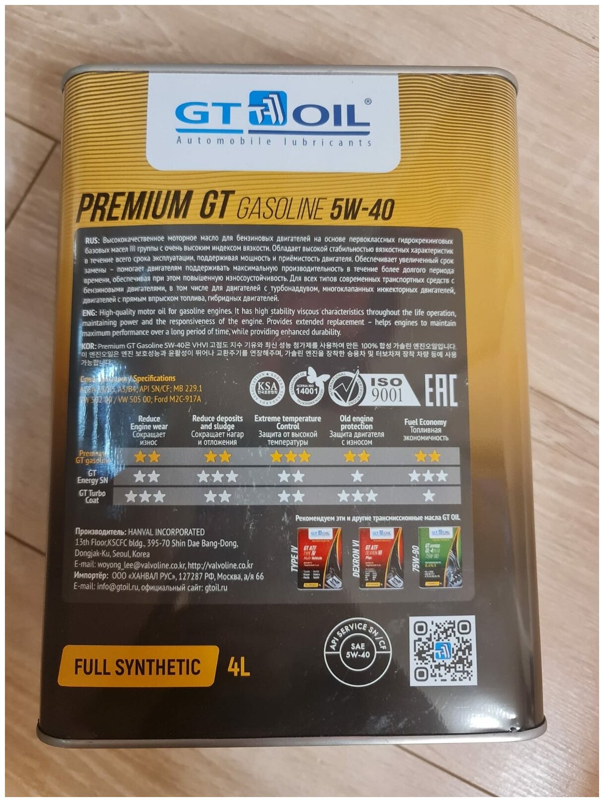 GT OIL Масло Premium Gasoline, SAE 5W-40, API Sn/cf, 4л 8809059407226 .
