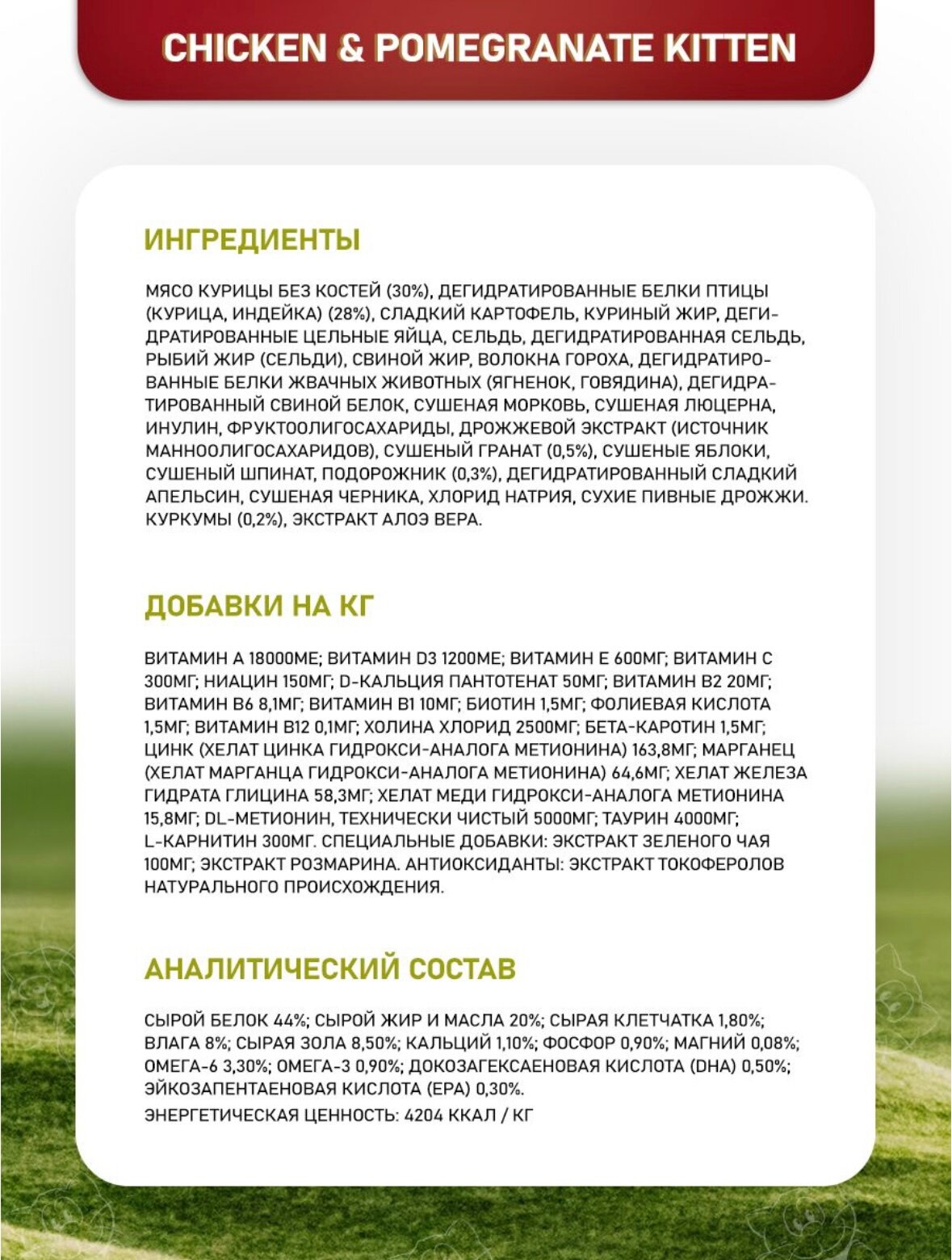 | Пищевая ценность | сырой протеин 44.00%, сырой жир и масла 20.00%, сырая клетчатка 1.80%, сырая зола 8.50%, кальций 1.50%, фосфор 1.30%, магний 0.09%, Омега-6 3.30%, Омега-3 0.90%, DHA 0.50%, EPA 0.30%, глюкозамин 1200мг, хондроитин сульфат 900мг/кг |