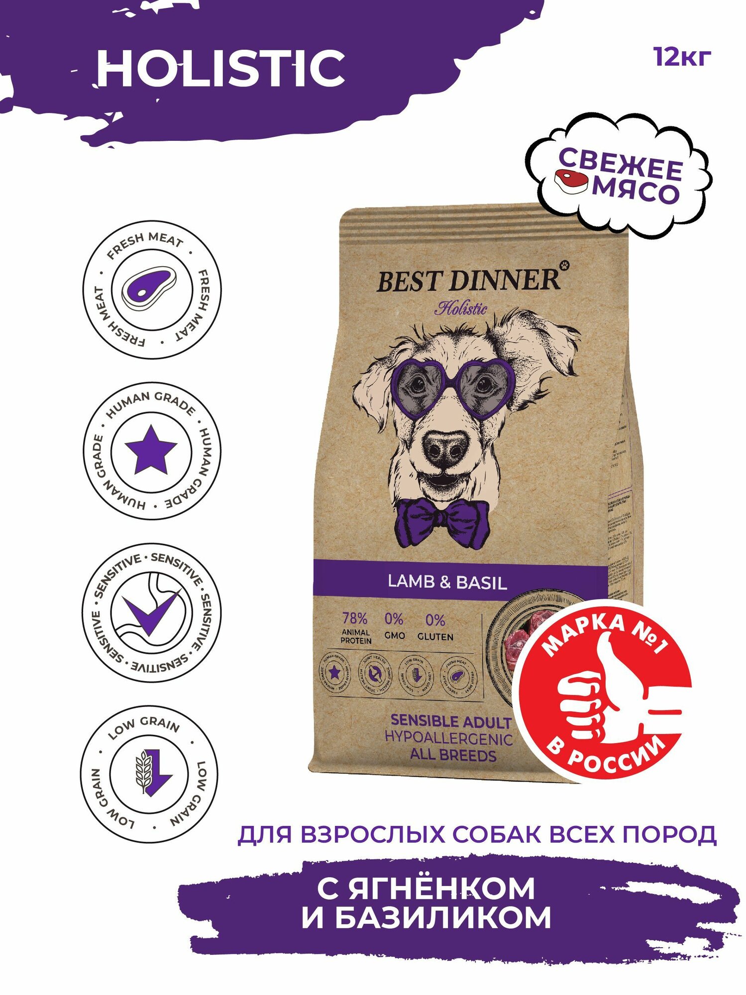 Best Dinner Holistic Adult Sensible Hypoallergenic сухой корм для собак с Ягненком и Базиликом 12кг